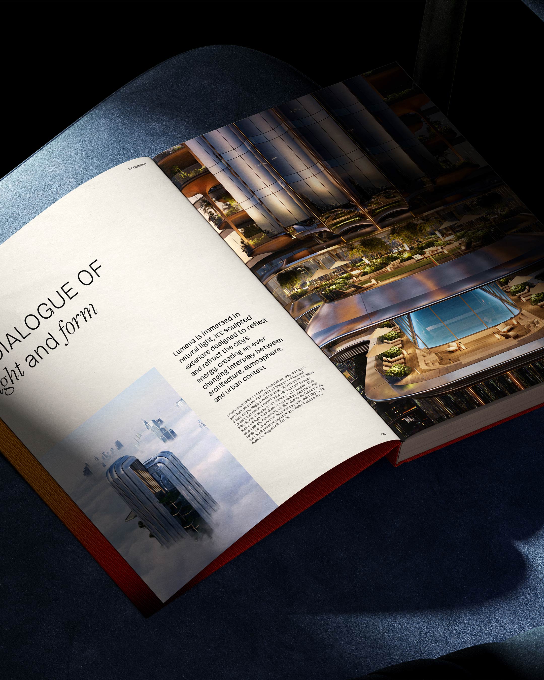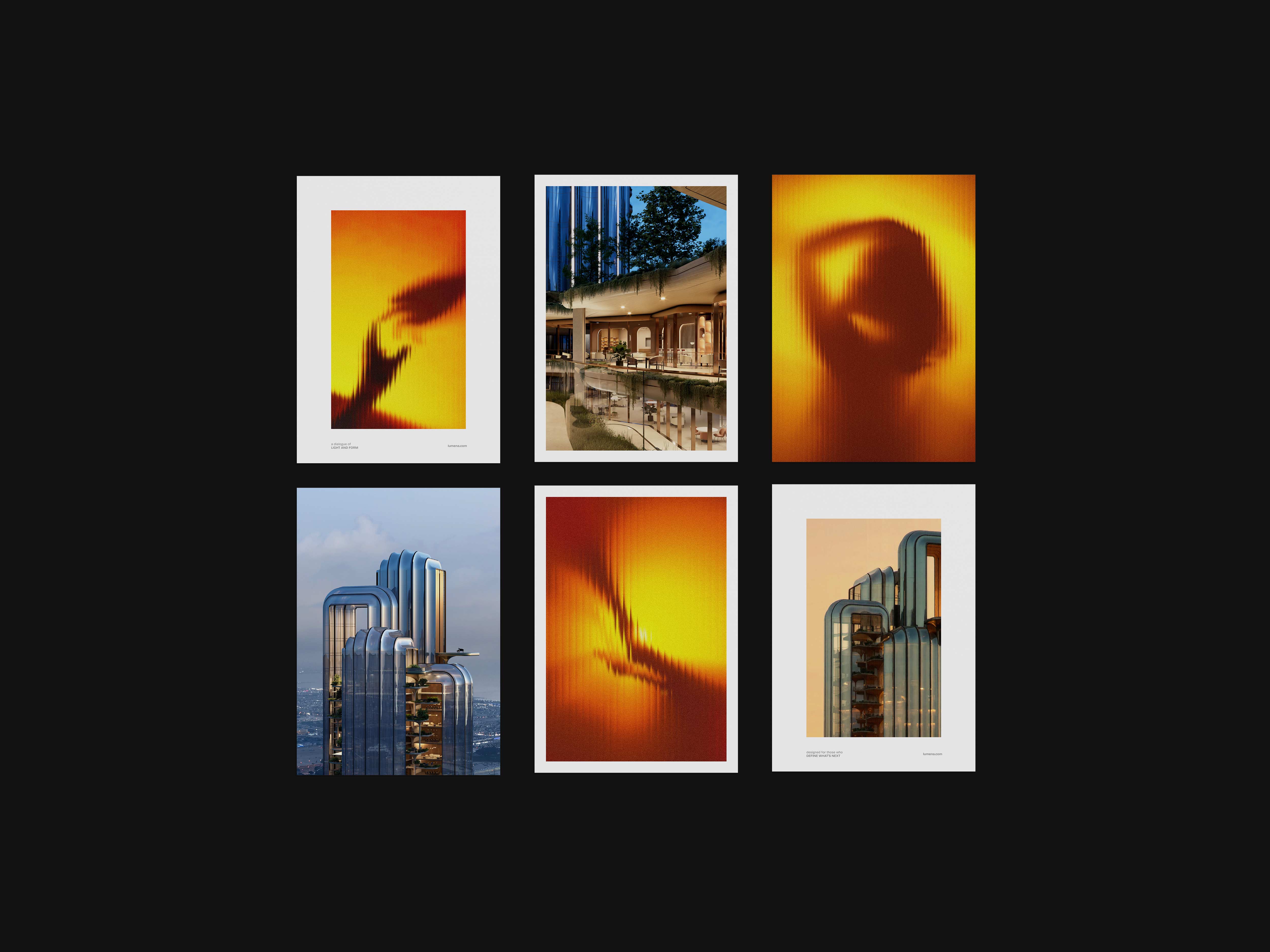 The visual language was closely informed by the architecture itself. References were drawn from the building’s waterfall-like exterior and its mirage-like presence at sunrise and sunset, when light refracts across the façade to produce striking hues of orange and warm tonal shifts. These cues informed the colour palette, graphic treatments, and overall brand expression, creating a direct and considered link between the physical structure and its identity. I was part of the core design team throughout the project, contributing across all stages from initial workshops and naming exploration through to final delivery. The collaborative approach ensured alignment between architectural intent, brand narrative, and market positioning.
