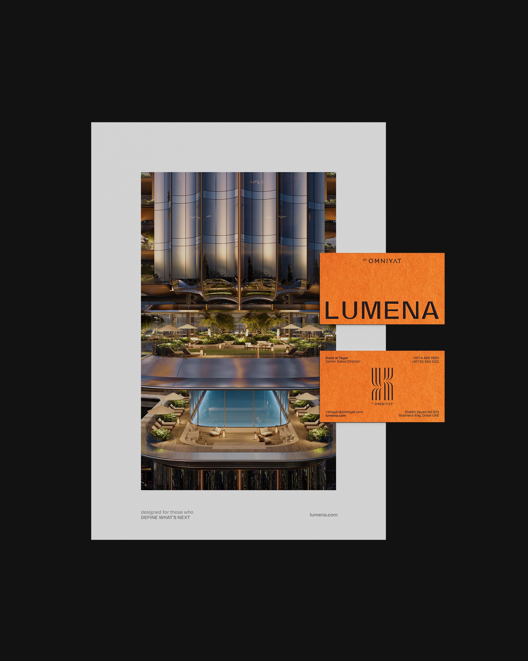The scope of work included the creation of a full brand identity for the tower, encompassing naming, logo development, typographic and colour systems, image direction, brand guidelines, stationery, and a launch campaign concept. Working within the fast-paced timelines characteristic of the Dubai market, the identity needed to feel both distinctive and commercially compelling from day one.